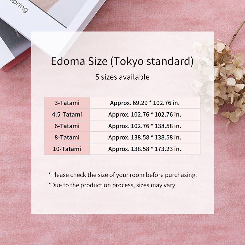 | Size | [Edoma Size (Tokyo standard)] 3-Tatami: W69.29 * L102.76 in. 4.5-Tatami: W102.76 * L102.76 in. 6-Tatami: W102.76 * L138.58 in. 8-Tatami: W138.58 * L138.58 in. 10-Tatami: W138.58 * L173.23 in. ([Edoma Size (Tokyo standard)] 3-Tatami: W176 * L261 4.5-Tatami: W261 * L261 6-Tatami: W261 * L352 8-Tatami: W352 * L352 10-Tatami: W352 * L440cm) |