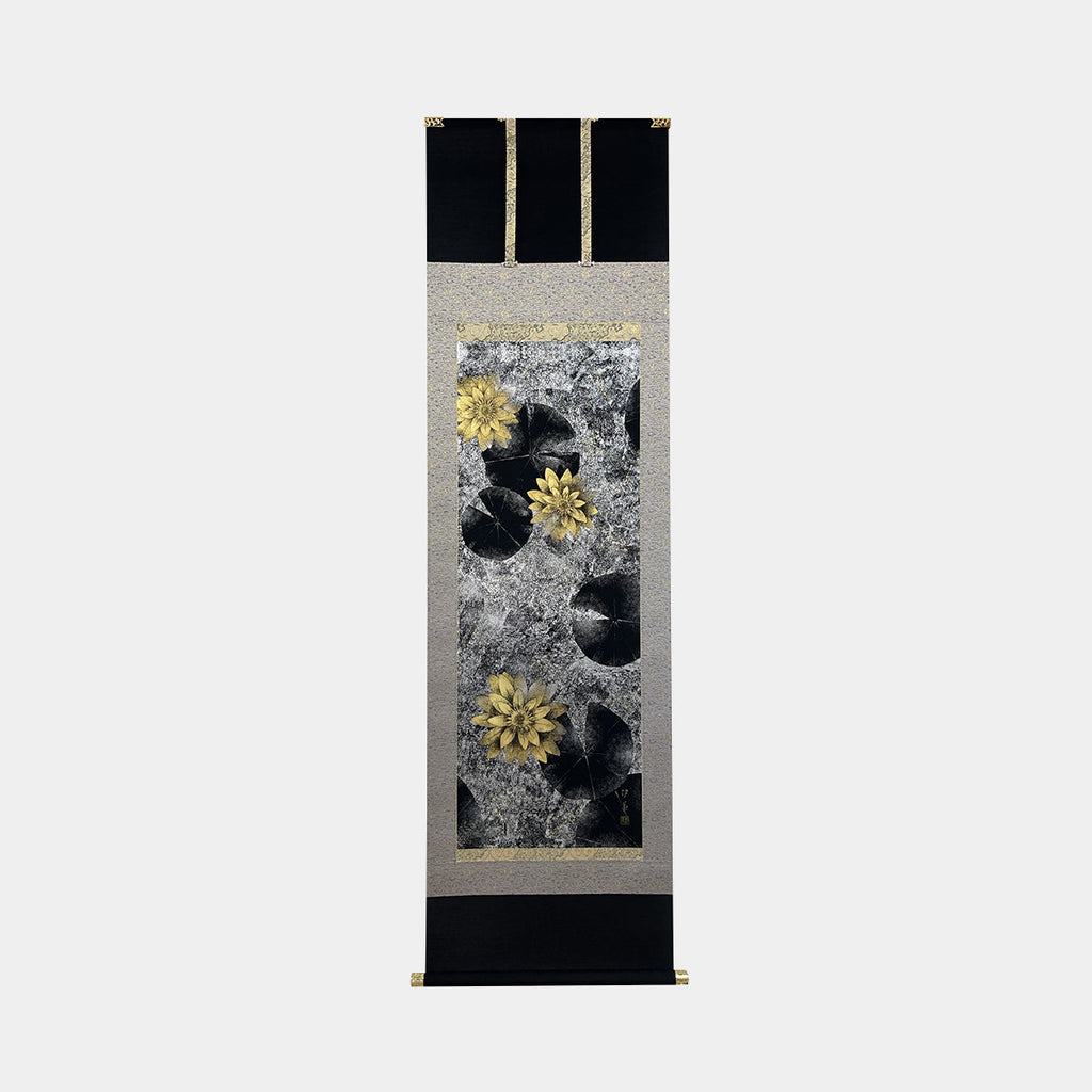 | Material | Main Artworkr: Black paper, Mounting: Yamato-style three-strip mounting [Fabric] Top and bottom: Cotton shina-pa Middle strip: Damask with small arabesque and floral motifs and gold leaf Center strip: Rinpa-style arabesque with Kyoto-style gold brocade Roller ends: Openwork gold scroll ends |