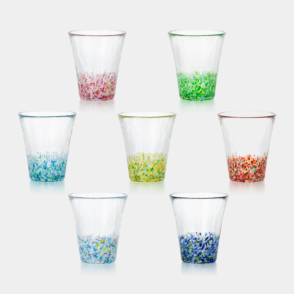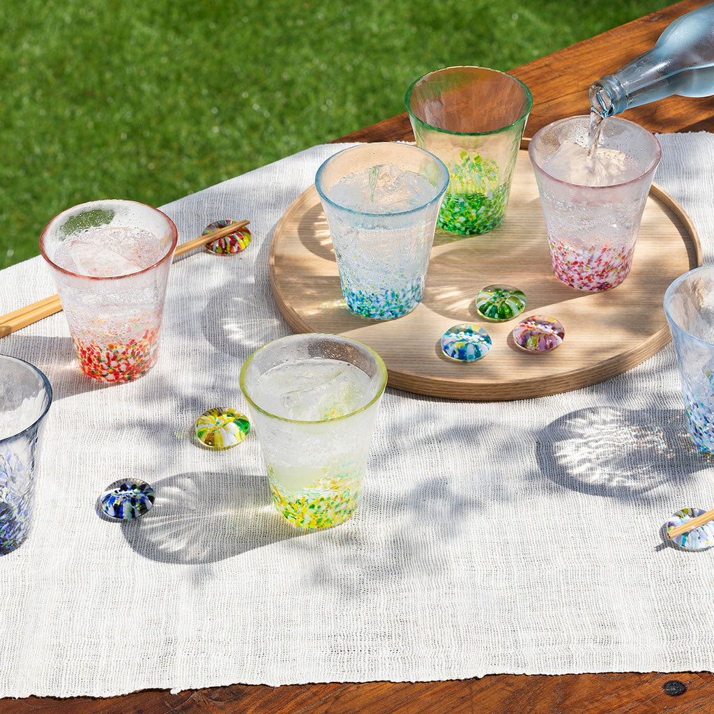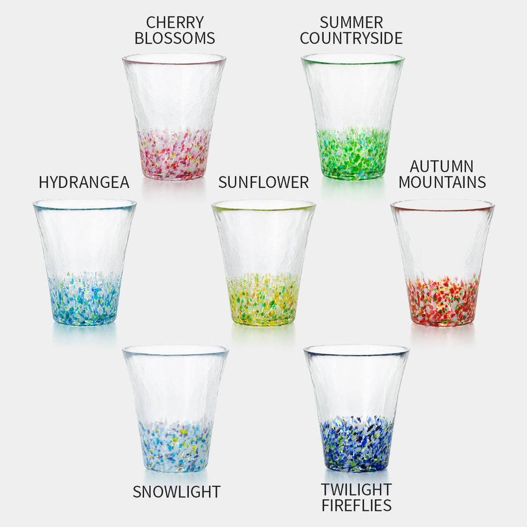 Tsugaru glassware is a hand-blown traditional craft reflecting the climate of Aomori. The "Colors of Japan" series depicts shifting seasonal landscapes by layering colored glass, where the shimmer, depth, and light-infused color gradients lend a sense of depth to the clear glass.