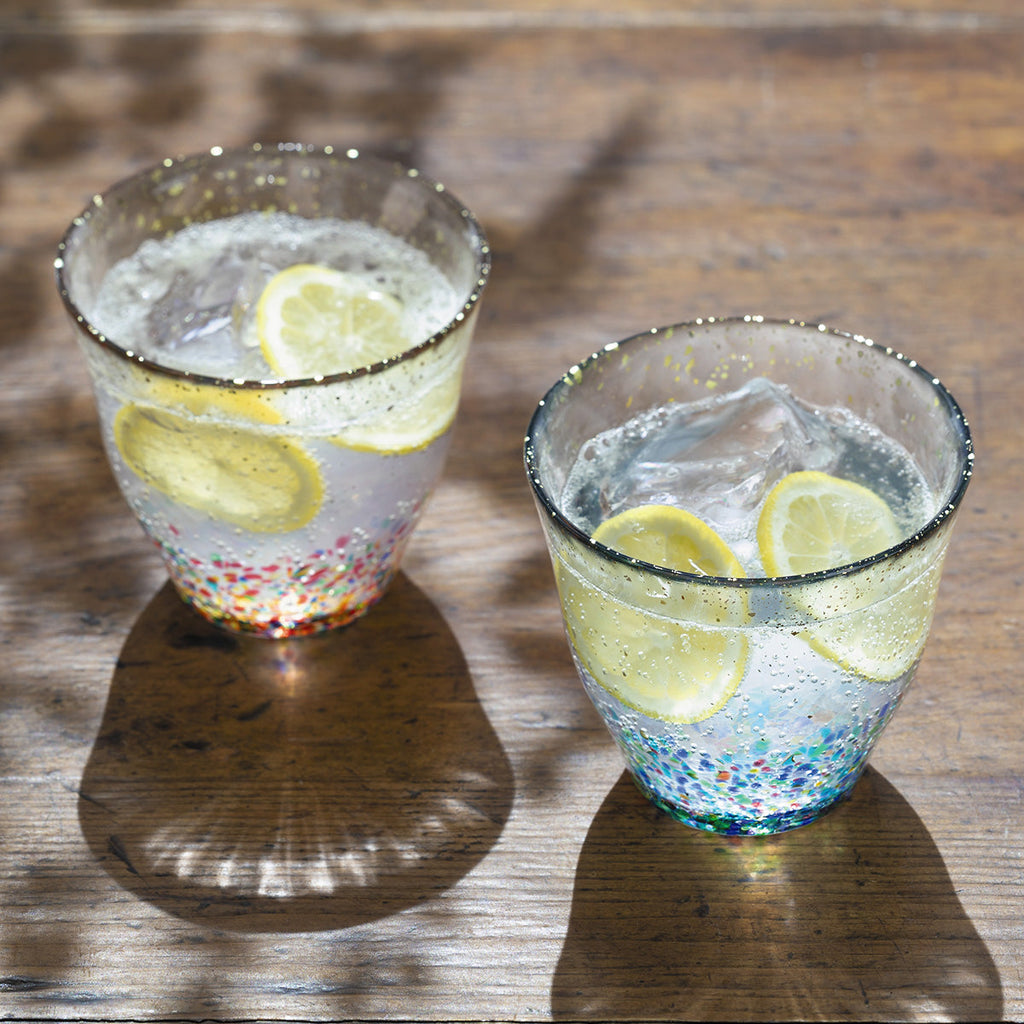 The "MATSURI" series is a pair of rock glasses featuring hand-blown Tsugaru glass adorned with gold accents, capturing colors reminiscent of night festival lights and bustling crowds.