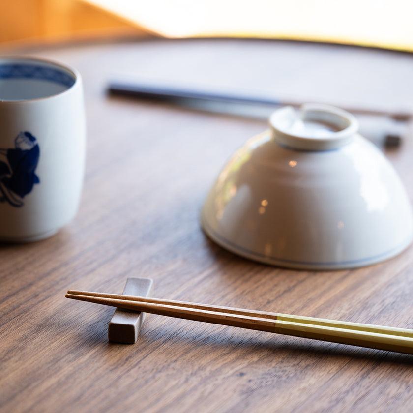 The included chopstick rest is a “Sandstone Chopstick Rest” crafted by Saikai Toki in Hasami Town, Nagasaki Prefecture, suitable for both Japanese and Western cuisine.