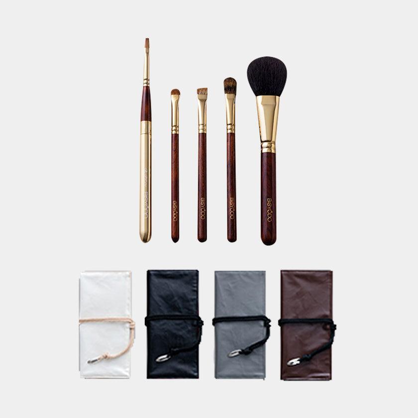 The set includes five brushes: blush, eyeshadow, eyebrow, shadow liner, and lip brushes.