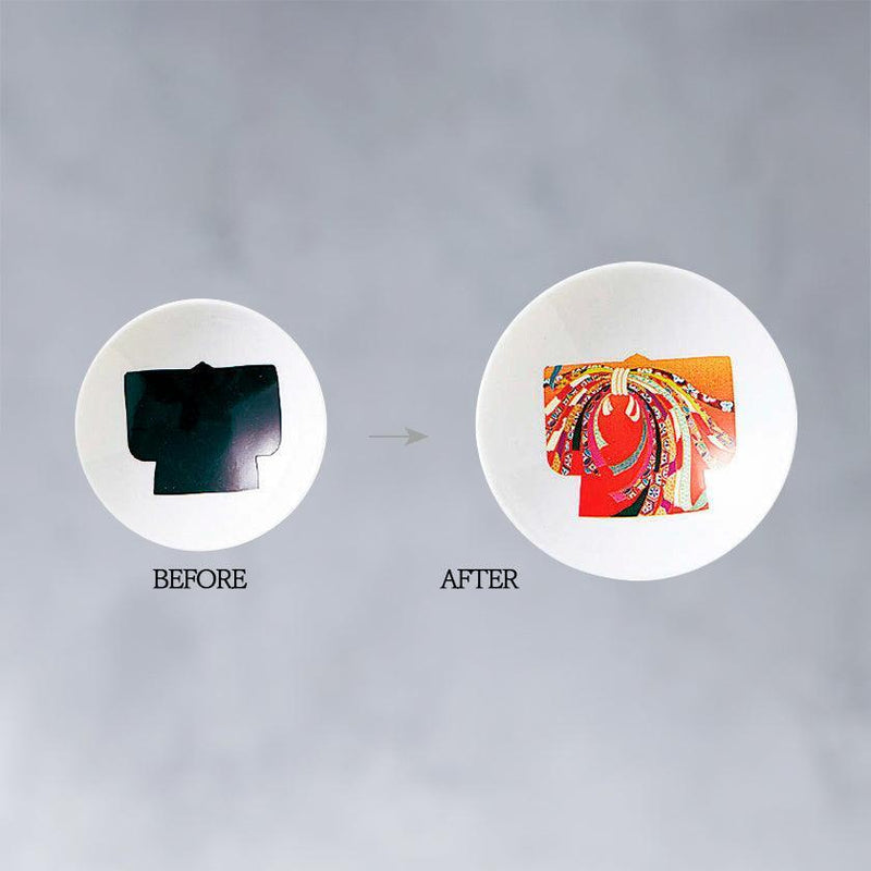 This flat sake cup from the Warmth Series transforms from a black silhouette to a vivid Kimono when filled with a beverage of approximately 45 degrees or higher.