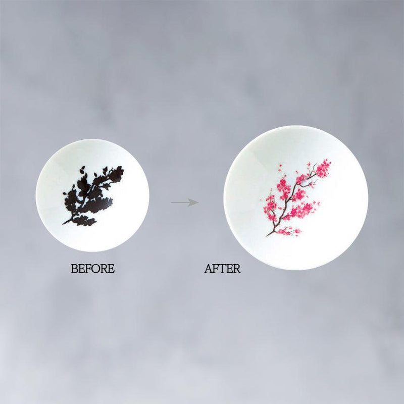This flat sake cup from the Warmth Series transforms from a black silhouette to a vivid Cherry blossoms when filled with a beverage of approximately 45 degrees or higher.