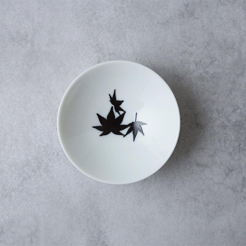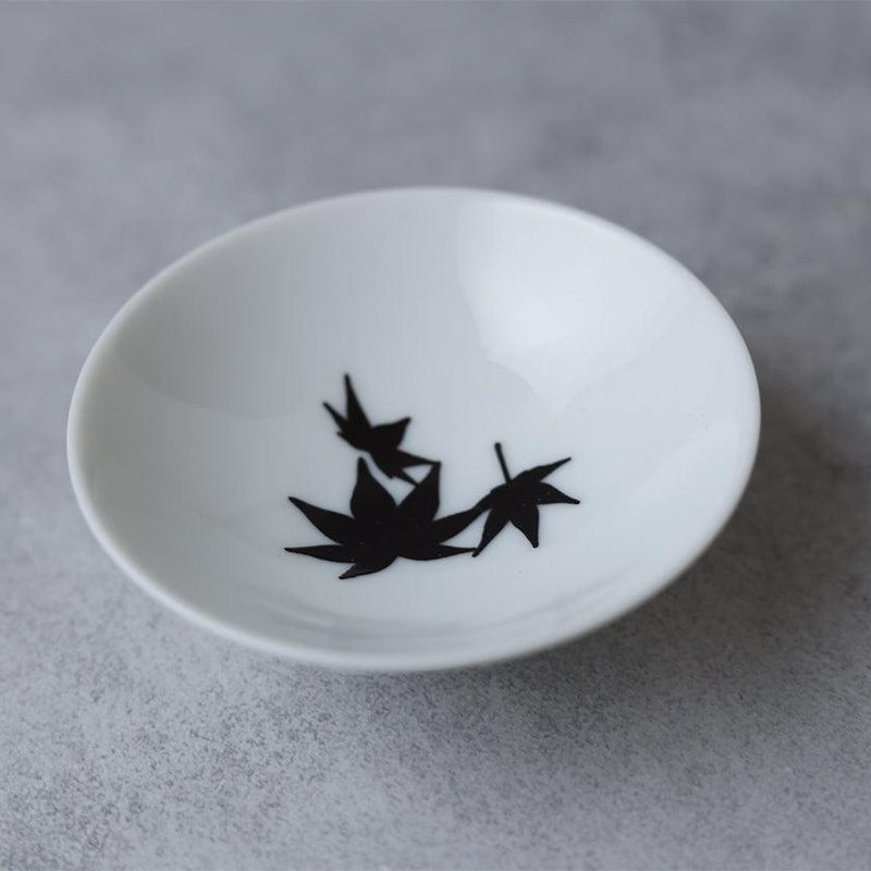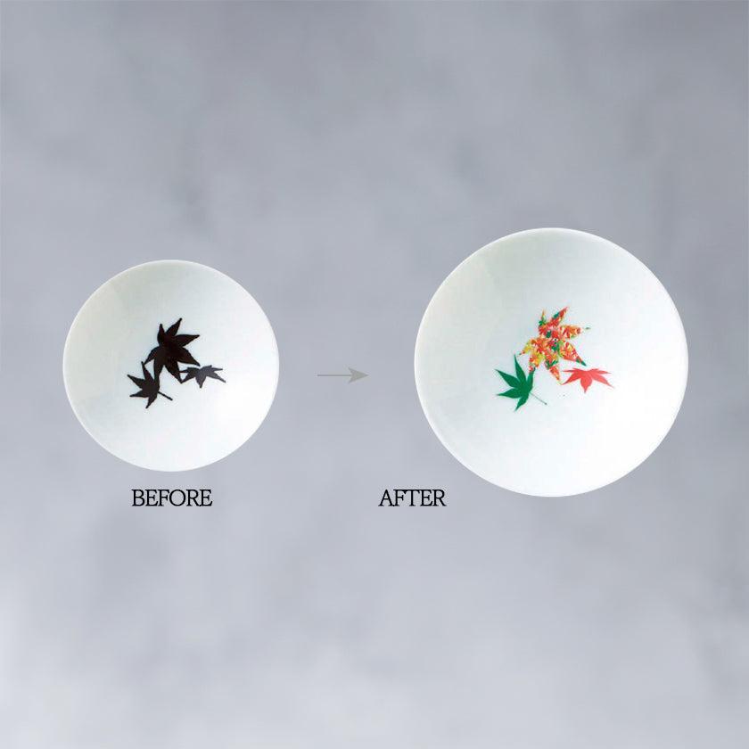 This flat sake cup from the Warmth Series transforms from a black silhouette to a vivid Autumn leaves when filled with a beverage of approximately 45 degrees or higher.
