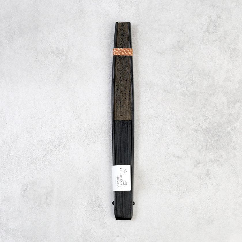 The delicate touch of the flowing feathers on this lacquered fan gives it a somewhat mysterious atmosphere.