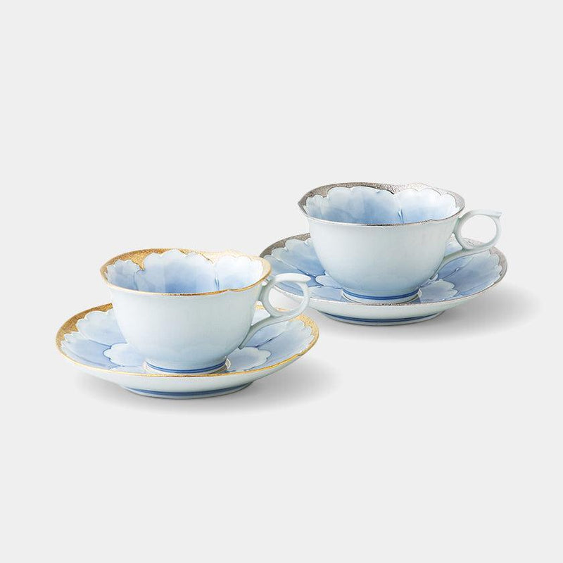 A pair of coffee cups and plates from the "Platinum Peony" series, decorated with gorgeous peony flowers in platinum on elegant white Hasamiyaki porcelain.