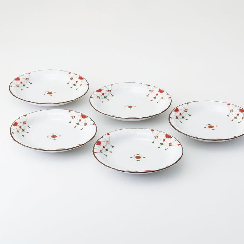 This set of dishes features a beautiful Yoraku pattern in red on a white background.