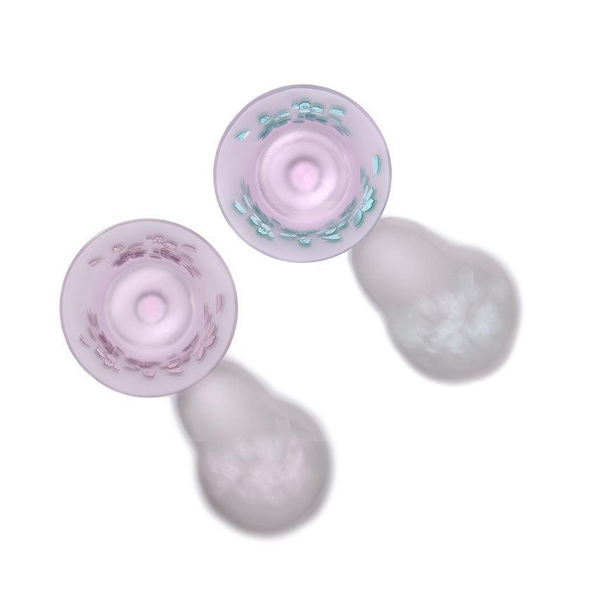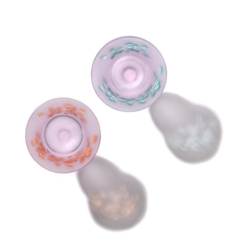 Each piece is individually hand-blown using a two-layer overlay glass technique. The vessel is then carefully hand-engraved, allowing the design to emerge through the contrast of two colors. The pink hue embodies the vibrant cherry blossom series. The gentle color palette and user-friendly design make these vessels enjoyable for all genders and ages.
