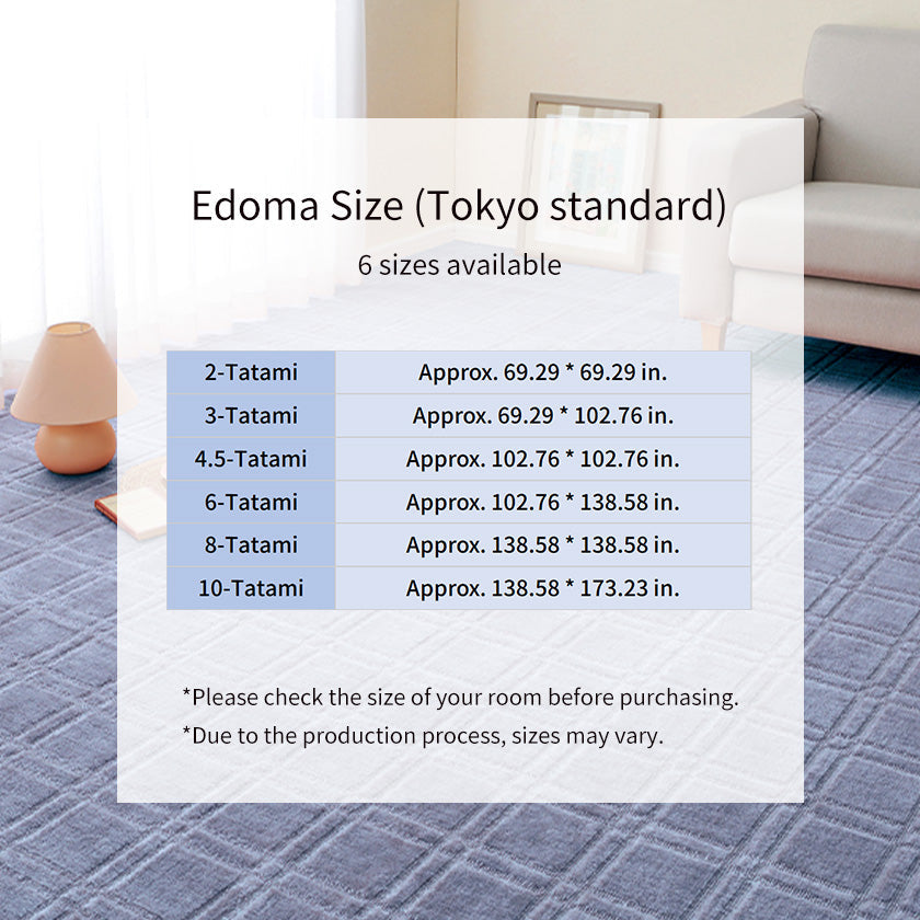 | Size | [Edoma Size (Tokyo standard)] 2-Tatami: W69.29 * L69.29 in. 3-Tatami: W69.29 * L102.76 in. 4.5-Tatami: W102.76 * L102.76 in. 6-Tatami: W102.76 * L138.58 in. 8-Tatami: W138.58 * L138.58 in. 10-Tatami: W138.58 * L173.23 in. [Honma Size (Kyoto standard)] 2-Tatami: W75.2 * L75.2 in. 3-Tatami: W75.2 * L112.6 in. 4.5-Tatami: W112.6 * L112.6 in. 6-Tatami: W112.6 * L150.39 in. 8-Tatami: W150.39 * L150.39 in. ([Edoma Size (Tokyo standard)] 2-Tatami: W176 * L176 3-Tatami: W176 * L261 4.5-Tatami: W261 * L261 6-Tatami: W261 * L352 8-Tatami: W352 * L352 10-Tatami: W352 * L440 [Honma Size (Kyoto standard)] 2-Tatami: W191 * L191 3-Tatami: W191 * L286 4.5-Tatami: W286 * L286 6-Tatami: W286 * L382 8-Tatami: W382 * L382cm) |