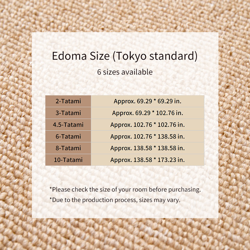 | Size | [Edoma Size (Tokyo standard)] 2-Tatami: W69.29 * L69.29 in. 3-Tatami: W69.29 * L102.76 in. 4.5-Tatami: W102.76 * L102.76 in. 6-Tatami: W102.76 * L138.58 in. 8-Tatami: W138.58 * L138.58 in. 10-Tatami: W138.58 * L173.23 in. ([Edoma Size (Tokyo standard)] 2-Tatami: W176 * L176 3-Tatami: W176 * L261 4.5-Tatami: W261 * L261 6-Tatami: W261 * L352 8-Tatami: W352 * L352 10-Tatami: W352 * L440cm) |