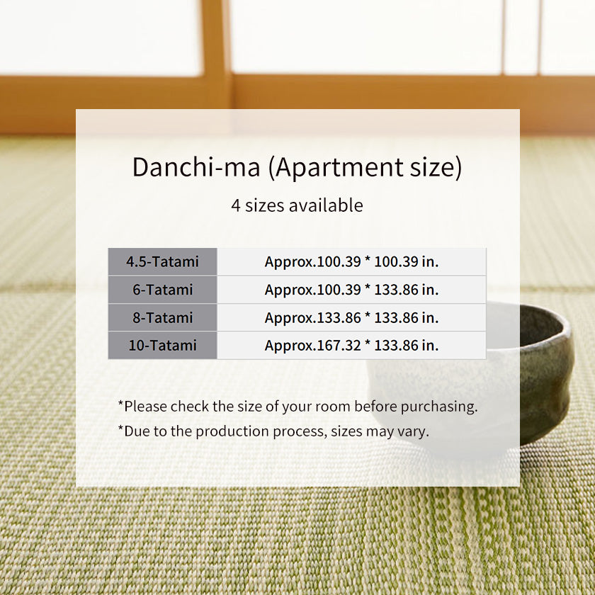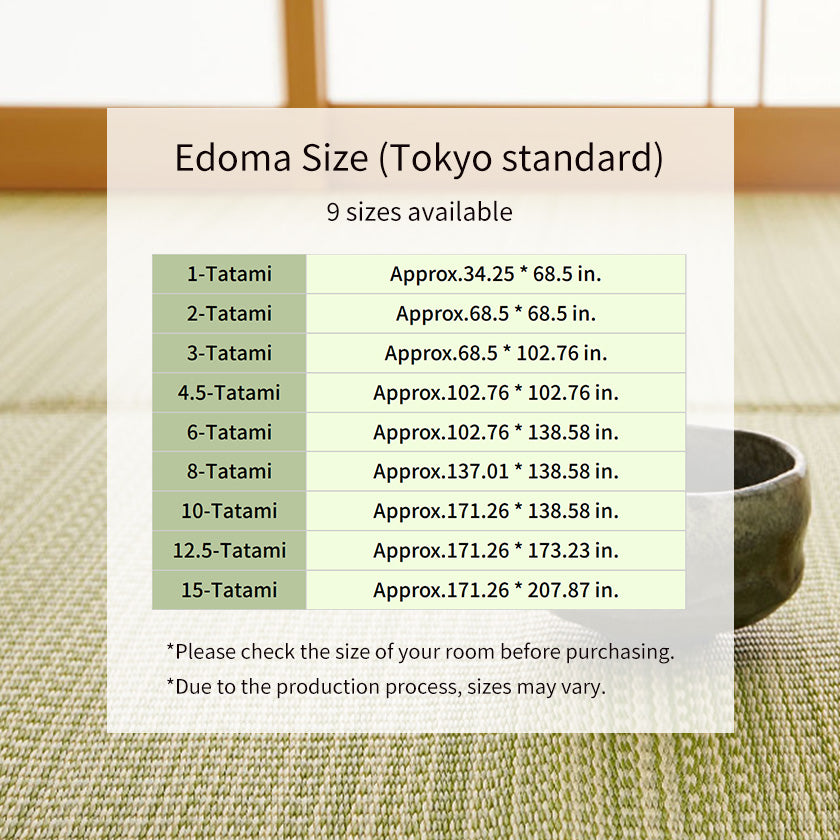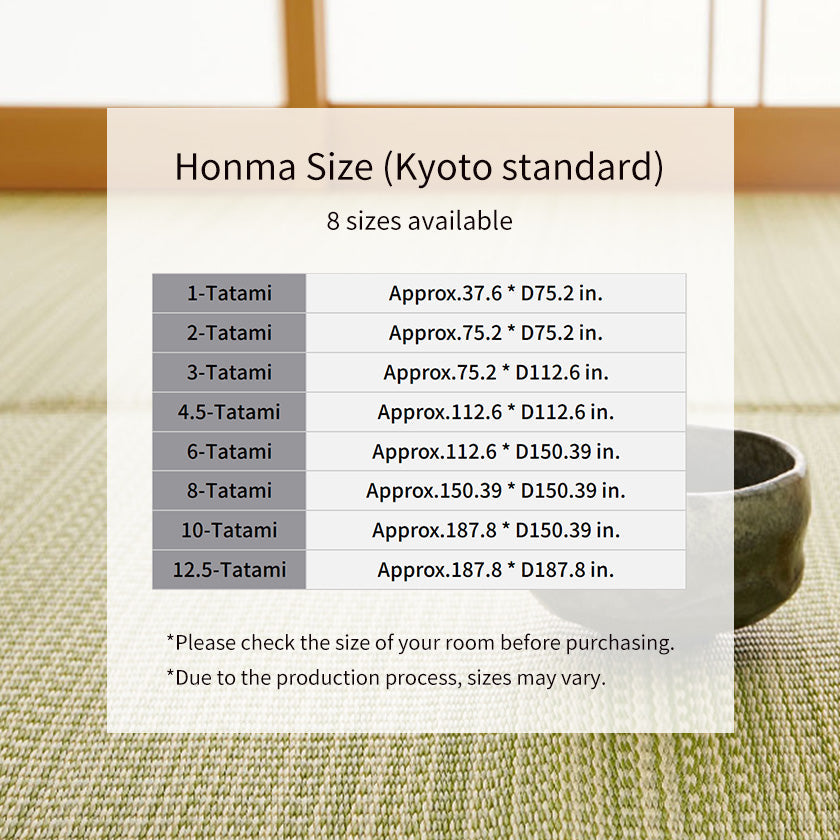 | Size | [Edoma Size (Tokyo standard)] 1-Tatami: W34.25 * L68.5 in. 2-Tatami: W68.5 * L68.5 in. 3-Tatami: W68.5 * L102.76 in. 4.5-Tatami: W102.76 * L102.76 in. 6-Tatami: W102.76 * L138.58 in. 8-Tatami: W137.01 * L138.58 in. 10-Tatami: W171.26 * L138.58 in. 12.5-Tatami: W171.26 * L173.23 in. 15-Tatami: W171.26 * L207.87 in. [Danchi-ma (Apartment size)] 4.5-Tatami: W100.39 * L100.39 in. 6-Tatami: W100.39 * L133.86 in. 8-Tatami: W133.86 * L133.86 in. 10-Tatami: W167.32 * L133.86 in. [Chukyo-ma (Nagoya standard)] 1-Tatami: W35.83 * L71.65 in. 2-Tatami: W71.65 * L71.65 in. 3-Tatami: W71.65 * L107.48 in. 4.5-Tatami: W107.48 * L107.48 in. 6-Tatami: W107.48 * L143.31 in. 8-Tatami: W143.31 * L143.31 in. 10-Tatami: W179.13 * L143.31 in. 12.5-Tatami: W179.13 * L179.13 in. 15-Tatami: W179.13 * L214.96 in. [Honma Size (Kyoto standard)] 1-Tatami: W37.6 * L75.2 in. 2-Tatami: W75.2 * L75.2 in. 3-Tatami: W75.2 * L112.6 in. 4.5-Tatami: W112.6 * L112.6 in. 6-Tatami: W112.6 * L150.39 in. 8-Tatami: W150.39 * L150.39 in. 10-Tatami: W187.8 * L150.39 in. 12.5-Tatami: W187.8 * L187.8 in. ([Edoma Size (Tokyo standard)] 1-Tatami: W87 * L174 2-Tatami: W174 * L174 3-Tatami: W174 * L261 4.5-Tatami: W261 * L261 6-Tatami: W261 * L352 8-Tatami: W348 * L352 10-Tatami: W435 * L352 12.5-Tatami: W435 * L440 15-Tatami: W435 * L528 [Danchi-ma (Apartment size)] 4.5-Tatami: W255 * L255 6-Tatami: W255 * L340 8-Tatami: W340 * L340 10-Tatami: W425 * L340 [Chukyo-ma (Nagoya standard)] 1-Tatami: W91 * L182 2-Tatami: W182 * L182 3-Tatami: W182 * L273 4.5-Tatami: W273 * L273 6-Tatami: W273 * L364 8-Tatami: W364 * L364 10-Tatami: W455 * L364 12.5-Tatami: W455 * L455 15-Tatami: W455 * L546 [Honma Size (Kyoto standard)] 1-Tatami: W95.5 * L191 2-Tatami: W191 * L191 3-Tatami: W191 * L286 4.5-Tatami: W286 * L286 6-Tatami: W286 * L382 8-Tatami: W382 * L382 10-Tatami: W477 * L382 12.5-Tatami: W477 * L477cm) |