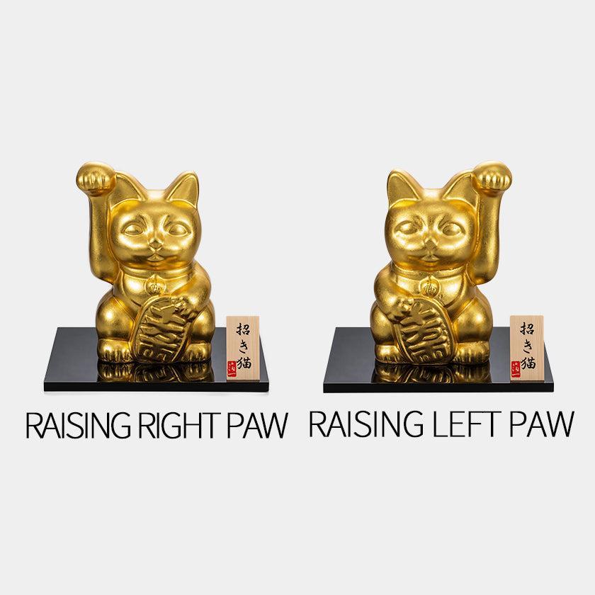 舉起左爪的招財貓是母貓。它像徵著人們的邀請,不僅是商業成功的護身符,也是家庭生活和諧、人際關係良好、浪漫圓滿和其他人際關係的護身符。